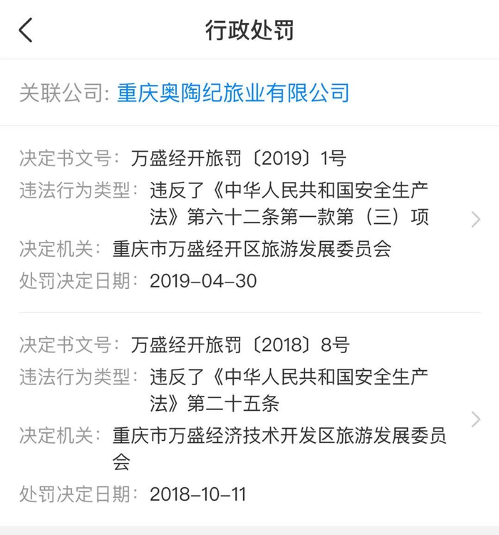 天眼查APP信息显示,重庆奥陶纪旅业有限公司曾因违反《中华人民共和国安全生产法》相关规定遭到行政处罚。