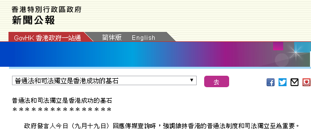 政府发言人今日(九月十九日)回应传媒查询时,强调维持香港的普通法制度和司法独立至为重要。