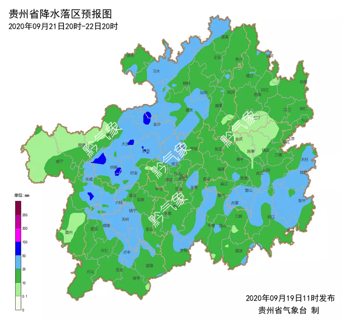 9月19日20时-9月20日20时:受前期累计降雨影响,全省大部地区地质灾害气象风险等级仍较高;其中毕节市南部、安顺市西部、六盘水市中北部、铜仁市大部、黔西南州北部和南部、黔南州惠水县地质灾害气象风险等级高,请注意防范!