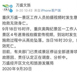 9月20日,重庆市万盛经济技术开发区文化和旅游发展局官方微博发布通报,重庆万盛一景区工作人员拍摄视频时发生意外,经抢救无效身亡。