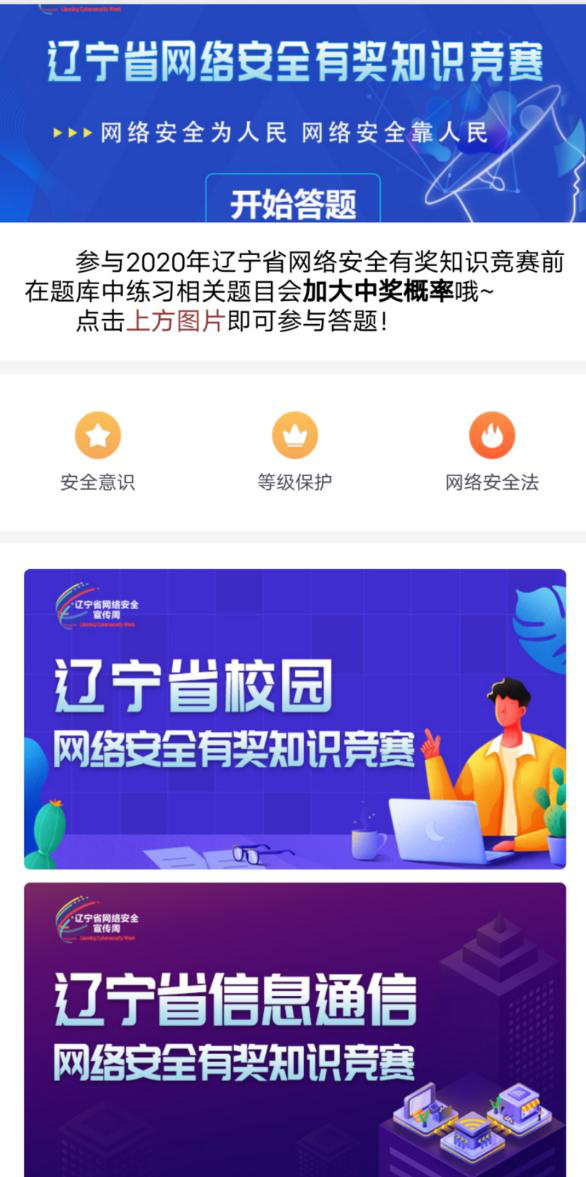 作为2020年辽宁省网络安全宣传周的一项重要活动,辽宁省网络安全知识竞赛自启动以来,受到社会各界的广泛关注,截至目前,参与人数已有40余万。竞赛采取题库组卷形式,由辽宁网信办统一安排部署,集中建立包含网络安全基础知识、防范意识、法律法规、基本技能等方面共计600余道题目的知识题库,参赛者可在活动期间进入题库中学习,不限次数,正式答题每手机号仅有一次机会,答题满分者将进入“辽宁省网络安全知识竞赛奖池”,待省内所有知识竞赛结束后统一随机抽奖。活动一经推出,省内主流媒体纷纷转载报道,全省上下掀起了网络安全知识技能学习热潮。
