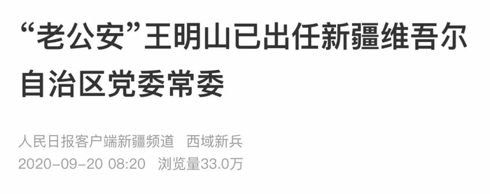 据《人民日报》20日报道,目前担任新疆维吾尔自治区政府副主席,自治区公安厅党委书记、厅长、督察长的王明山已出任新疆维吾尔自治区党委常委。