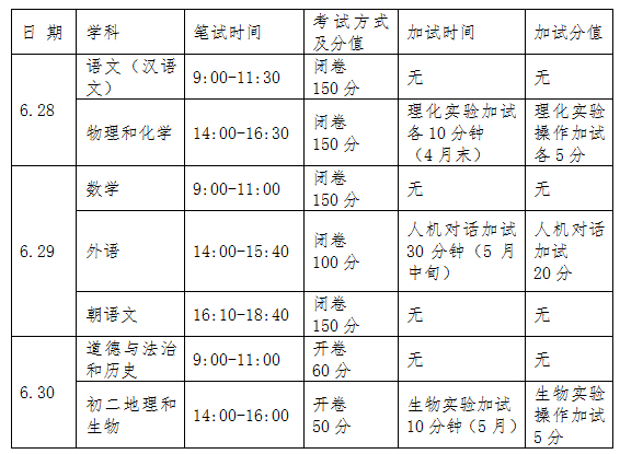 答:语文、数学、外语、物理、化学、道德与法治、历史7个学科纸笔测试安排在初三年级第二学期,时间为每年6月28日-30日。