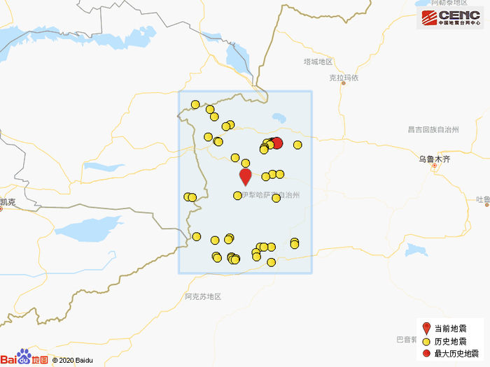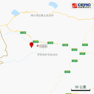 历史地震:根据中国地震台网速报目录,震中周边200公里内近5年来发生3级以上地震共138次,最大地震是2017年8月9日在新疆博尔塔拉州精河县发生的6.6级地震(距离本次震中119公里),按震级大小前50次历史地震分布如图。