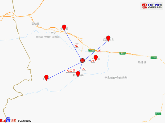 周边县城:震中距巩留县24公里、距特克斯县27公里、距尼勒克县60公里、距伊宁县67公里、距昭苏县73公里,距伊犁哈萨克自治州72公里,距乌鲁木齐市460公里。