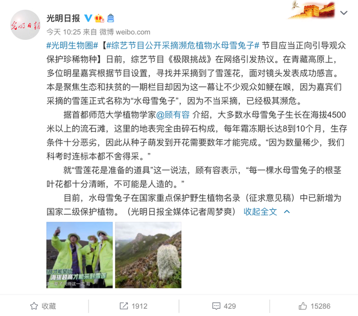 因为嘉宾们采摘的并非是“雪莲”,而是名列《国家重点保护野生植物名录(征求意见稿)》中的“水母雪兔子”,该植物已经极其濒危。