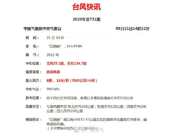 9月21日14时今年第12号台风 “白海豚”(热带风暴级)生成,其中心位置位于我市偏东方向约2100公里的西北太平洋海面上,中心附近最大风力8级(约65公里/小时),将以每小时10-15公里左右的速度向北偏西方向移动,强度逐渐加强。