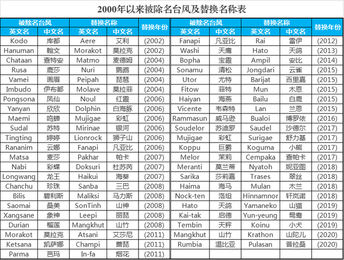 曾使用(被除名)的台风名和现用的台风名如下表。
