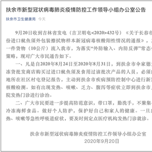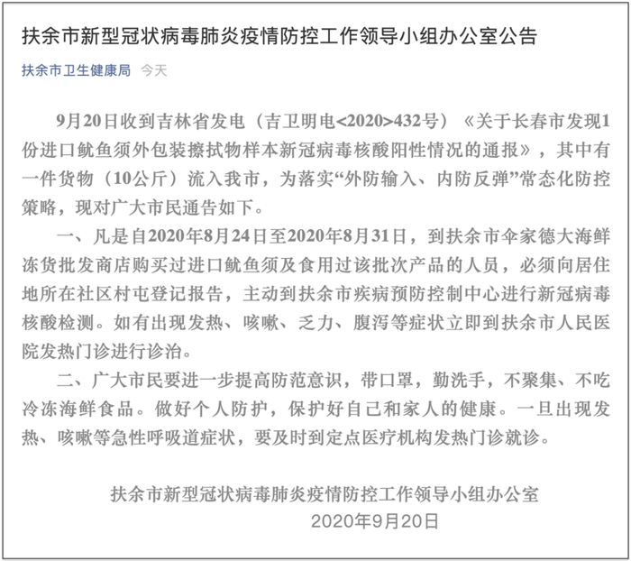 9月20日,吉林省扶余市疫情防控领导小组办公室在微信公众号“扶余市卫生健康局”上发布公告,称当天收到吉林省发电(吉卫明电<2020>432号)《关于长春市发现1份进口鱿鱼须外包装擦拭物样本新冠病毒核酸阳性情况的通报》,其中有一件货物(10公斤)流入扶余,为落实“外防输入、内防反弹”常态化防控策略,现对广大市民通告如下:
