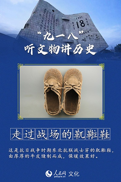 这是一双造型奇特的鞋:鞋面抽成一圈均匀的褶儿,褶儿后面是一个向上凸起的“舌头”,鞋口周边再窜上细细的牛皮带子。这种鞋被称作“靰鞡鞋”,是抗联战士们冬日作战的重要“装备”。靰鞡鞋用厚厚的牛皮缝制而成,既温暖又舒服。