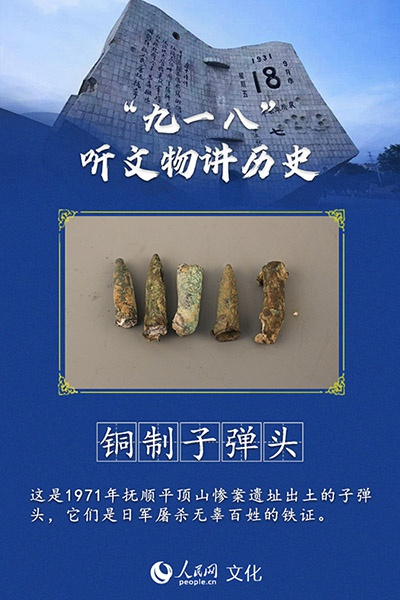 1932年中秋节过后,侵华日军在平顶山制造了一场针对无辜平民的大屠杀。这5枚锈迹斑斑的子弹头,于1971年在抚顺平顶山惨案遗址出土。这些沾染着平顶山无辜平民鲜血的子弹头,是侵华日军屠杀无辜百姓的铁证。