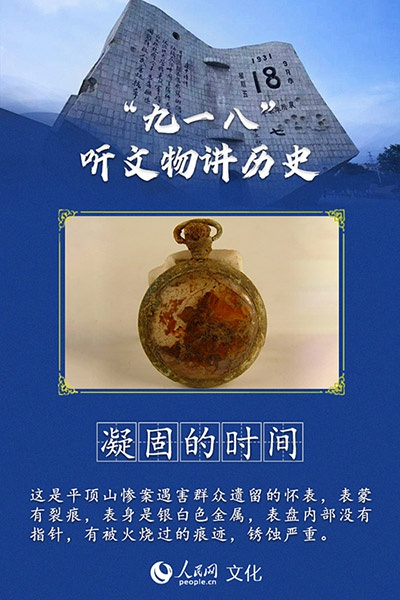 这只怀表于1971年从抚顺平顶山惨案遗址出土,表蒙有明显的裂痕,表盘内已经没有指针。虽然锈蚀严重,但仍能看到被火烧过的痕迹。这只没有指针的怀表,凝固了时间,也凝固了侵华日军的滔天罪行。
