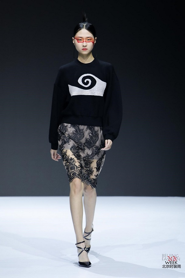 设计理念:此次“彝族刻板印象”在服装和服饰设计上,将彝族的服饰文化特点与最能展现女性柔美的旗袍相结合,保持彝汉两族经典元素的同时,把看似对立的不同服饰特点进行商业设计。在色彩上,取用彝族经典三原色,黑红黄。并且直接采用彝族经典羊角纹样作为图案搭配旗袍。模特造型的长辫子是彝族少女的日常装扮,配有与服装颜色与材质相同的头绳。