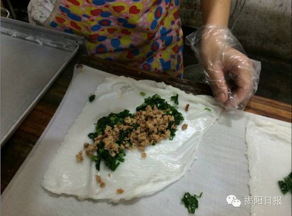客家人称之为“捆粄”,属于客家小吃。传说,丰顺客家人祖先自北南迁后,因当地不种小麦,无面粉可制春卷,就用大米磨粉制皮代替春卷皮,这就是捆粿的诞生过程。捆粄蕴含北风南味,极具特色,口味多样,深受人们的欢迎。“虽然捆粿是丰顺的特色小吃,但是近年来,玉湖这边制作捆粿的小店开得甚至比丰顺那边还多,许多丰顺人反而到玉湖来吃捆粿呢。”