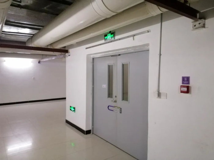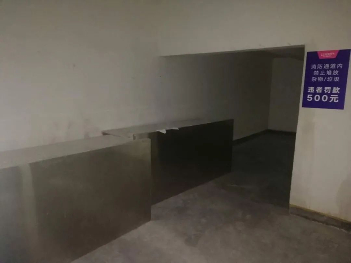 在公园时代城购物中心三层的一个封闭疏散通道,墙上写着消防通道内禁止堆放杂物和垃圾。但是在这个提示牌旁边就是两个大铁柜子。从柜子上灰尘我们可以看出。这俩柜子应该在这里存放了很长时间了。
