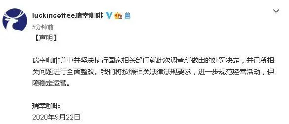 对于该处罚决定,瑞幸咖啡官微刚刚发表声明,瑞幸咖啡尊重并坚决执行国家相关部门就此次调查所做出的处罚决定,并已就相关问题进行全面整改。我们将按照相关法律法规要求,进一步规范经营活动,保障稳定运营。