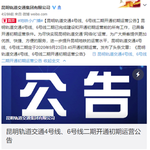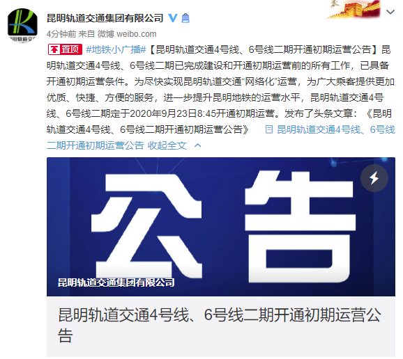 昆明轨道交通4号线、6号线二期已完成建设和开通初期运营前的所有工作,已具备开通初期运营条件。为尽快实现昆明轨道交通“网络化”运营,为广大乘客提供更加优质、快捷、方便的服务,进一步提升昆明地铁的运营水平,昆明轨道交通4号线、6号线二期定于2020年9月23日8:45开通初期运营。现将初期运营有关事项公告如下: