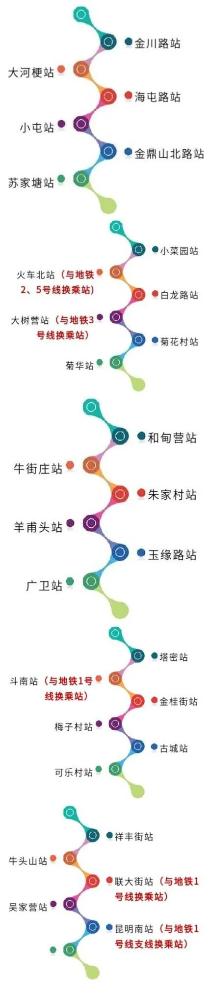 据统计,4号线共设29个车站、2个停车场和1个车辆段,承东启西,接南转北,打破了1、2号线十字形格局,逐渐形成昆明轨道交通网络,据了解,4号线29个站点中有15个可以实现换乘。