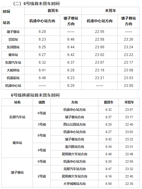 6号线二期与一期贯通后:6:20—23:00(其中:塘子巷站往机场中心站方向为6:20—22:55,机场中心站往塘子巷站方向为6:20—23:00)。