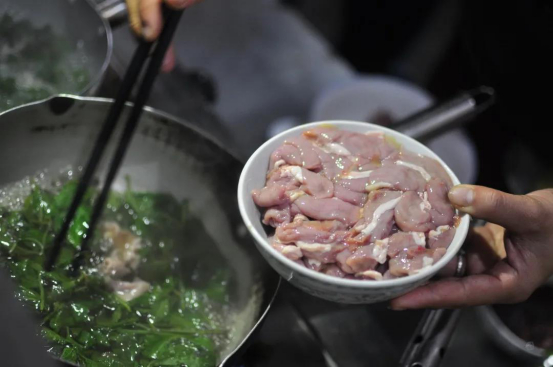 然后,锅内倒入油,油热之后放入蒜头碎末,爆香,加水。水开了之后下红粬(或酒糟),再加入枸杞叶、猪肉、猪肝、猪粉肠,用筷子搅拌,然后下点盐、鸡精,滚煮后即可上桌。猪肉猪肝不能煮太久,不然就不嫩了。