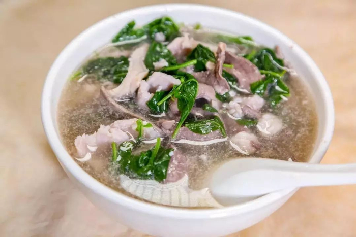 据介绍,三及第汤的做法也很简单。新鲜的瘦肉、猪肝、猪粉肠是三及第的标准配方,青菜可以是枸杞叶,也可以是萝卜青。