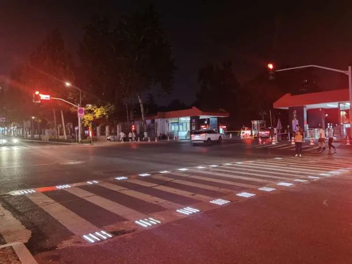 为提高夜间行人过街安全性,近期,济南市首条会发光的斑马线正式投入使用。这条斑马线位于文化东路与山师北街交叉口(山东师范大学北门)。通过对东西两侧斑马线的提升,系统内部自动感应设备可根据光线适时开启:每日下午18点光线昏暗时启动灯光,次日早上6点天亮后自动关闭。( 山东商报·速豹新闻记者 张舒)