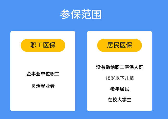 而居民医保主要面向没有工作单位的城市居民,参保范围是18岁以下儿童、没有缴纳职工医保人群,老年居民,在校大学生等等。