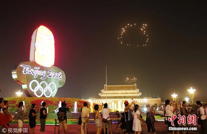 2008年8月8日,天安门广场上空燃放北京奥运会开幕式焰火《历史足迹》,烟花组成的“大脚印”在夜空绽放,在全世界的注视下,一步步走向鸟巢。图片来源:视觉中国