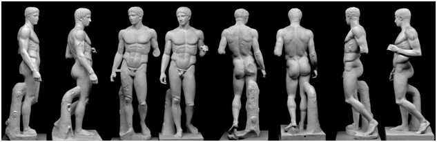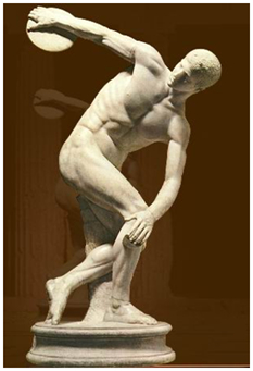 在西方,对人体肌肉线条的偏爱早在古希腊就已开始。例如,公元前5世纪希腊雕塑家米隆的作品《掷铁饼者》,就通过对肌肉线条和身体动感的描绘,将古希腊人的青春力量和健美体魄表现了出来。从米隆的作品来看,古希腊艺术对身体线条的描绘已近大成,这是继承传统希腊艺术的结果:希腊艺术在首创时就偏爱几何图形,在公元前7世纪左右的古风时代就广泛吸取了世界各地的数学知识,希望在数学知识的基础上进行艺术设计。
