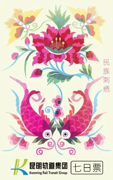 该票面为本次推出的七日卡票面,来源于昆明地铁首届票卡设计大赛,选取云南少数民族刺绣元素,鲜艳的色彩、传统的图案,彰显了别具一格的云南民族文化特色。