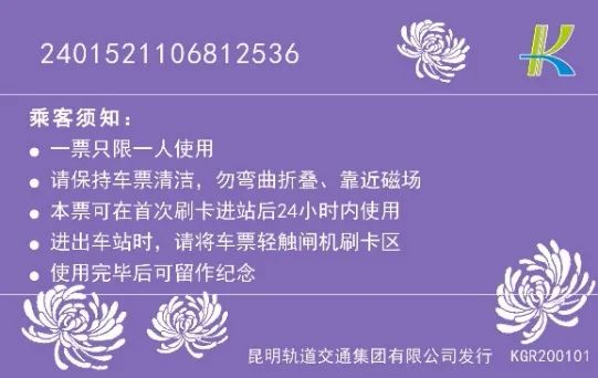该票面为本次推出的一日卡票面,来源于昆明地铁首届票卡设计大赛,票面以风景名胜为载体,描绘了秋夜于大观楼赏菊赏月的场景,通过“花、月、夜”等元素,展示昆明花之城的静谧之美。