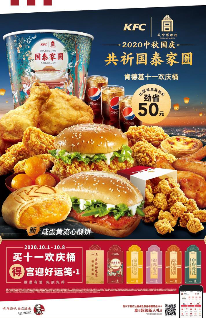 10月1日起,在到店、自助点餐到店自取或通过肯德基宅急送购买十一欢庆桶时就有机会获得随机1张,限量168万张,让消费者品味美食的同时更有开“盲盒”的有趣体验。全国各地的肯德基餐厅也将在双节期间举办缤纷的创意活动,与消费者共迎传统佳节。