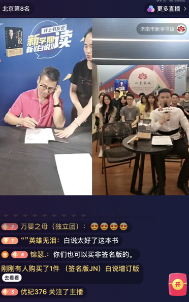 18时45分,比预定时间提前15分钟,白岩松出现在直播画面中。“今天北京不是那么堵,一不注意我就到早了。我就想,签着也是签着,您等着也是等着,那咱们为什么不早点聊呢?说是7点开始,6点45咱们就开聊,这样的话不就能多聊15块钱的吗?”白岩松一边给书签着名,一边轻快地跟网友絮叨。