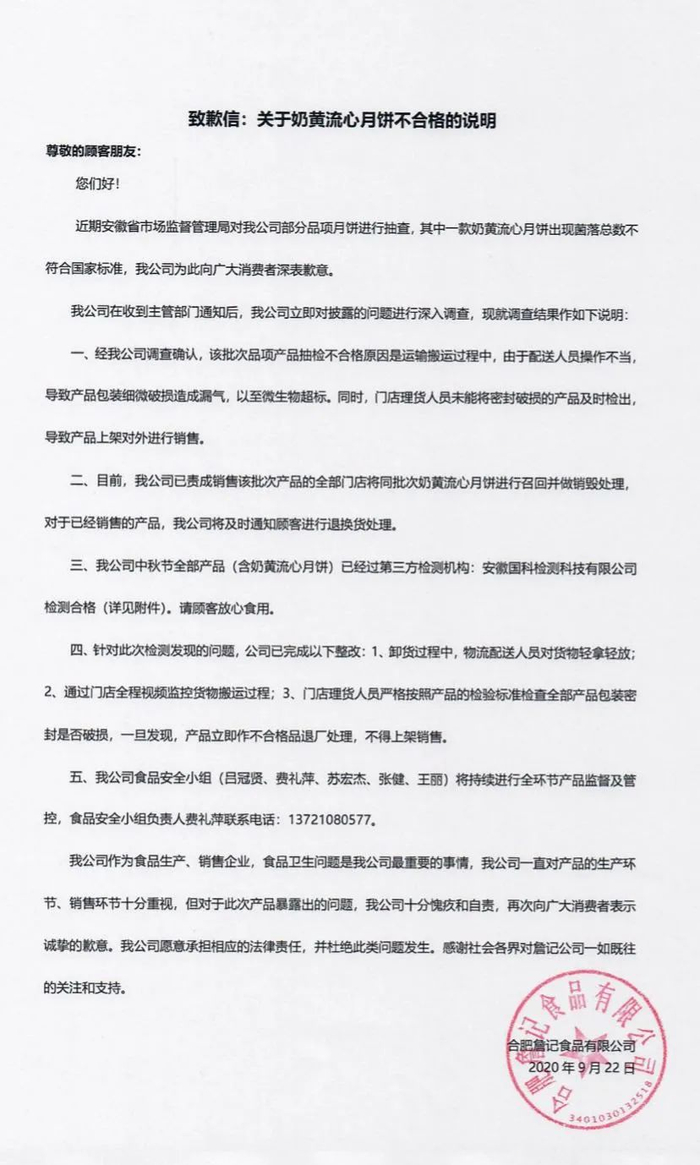 合肥詹记食品有限公司发布致歉信
