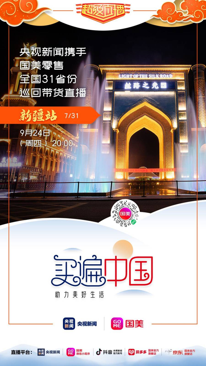 9月24日晚20点,记得锁定国美微信小程序、京东国美官方旗舰店、拼多多国美官方旗舰店,及央视新闻的客户端、一起品味大美新疆、体验西域古风。