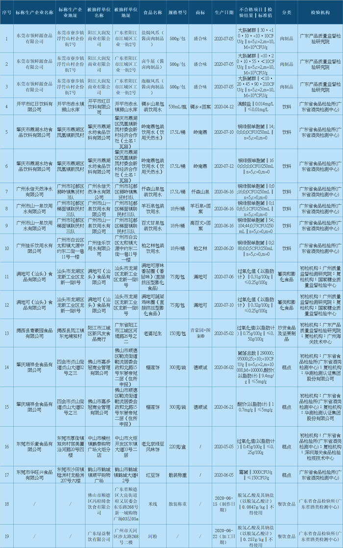 根据2020年国家和广东省食品安全监督抽检计划,广东省市场监督管理局组织抽检粮食加工品、肉制品、饮料、罐头、薯类和膨化食品、炒货食品及坚果制品、可可及焙烤咖啡产品、糕点、餐饮食品、食用农产品等10类食品774批次样品。根据食品安全国家标准检验和判定,其中抽样检验项目合格样品755批次、不合格样品19批次,检出微生物污染、其他污染物超标、食品添加剂超范围使用及质量指标问题。