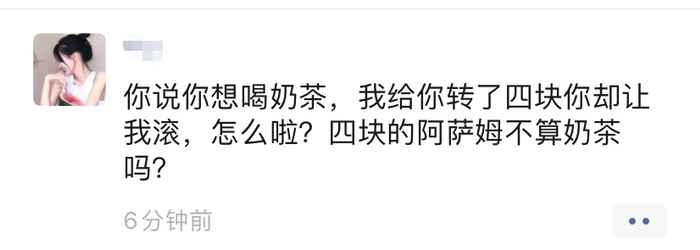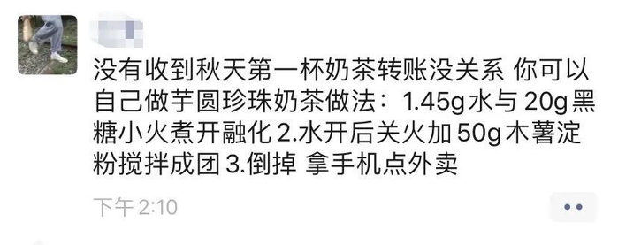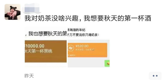 3、还有家里人和父母之间要秋天第一杯奶茶的红包,然后发到朋友圈里秀感情。