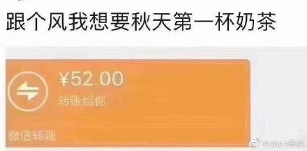 2、一般情侣之间发秋天第一杯奶茶红包的比较多,数字都是52.0类似的。