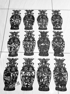 孙凤花介绍,在太原市争创全国文明城市之际,她就在想,能不能自己也剪出一幅作品来。后来,她也通过网络进行搜索,又结合自己的创意,她决定创作一套刻有社会主义核心价值观的12个花瓶,花瓶上有12个词:“富强、民主、文明、和谐、自由、平等、公正、法治、爱国、敬业、诚信、友善”。