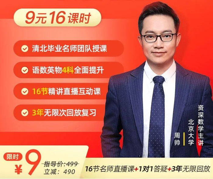● 初中:数学+语文+英语+物理=16节课=9元