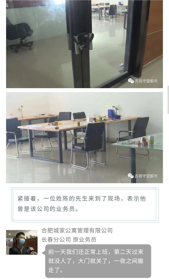 最近有网友爆料,说合肥城家公寓管理有限公司设置在全国很多地区的分公司都闭店了,很多出租和承租房子的人都遭到欺骗,房东、租户甚至公司的业务员都成了受害者。而就在此时,我们栏目也接到了消费者投诉,长春的一家“城家”公司也闭店了。