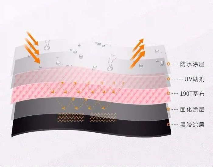 这款伞布虽薄,但却有着5层防护科技优质阻光隔热、超耐磨损的高密度碰击布同时反复压合黑胶+优质的防晒涂层。