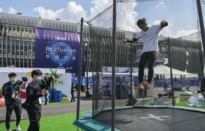参观者在超级集市体验蹦床