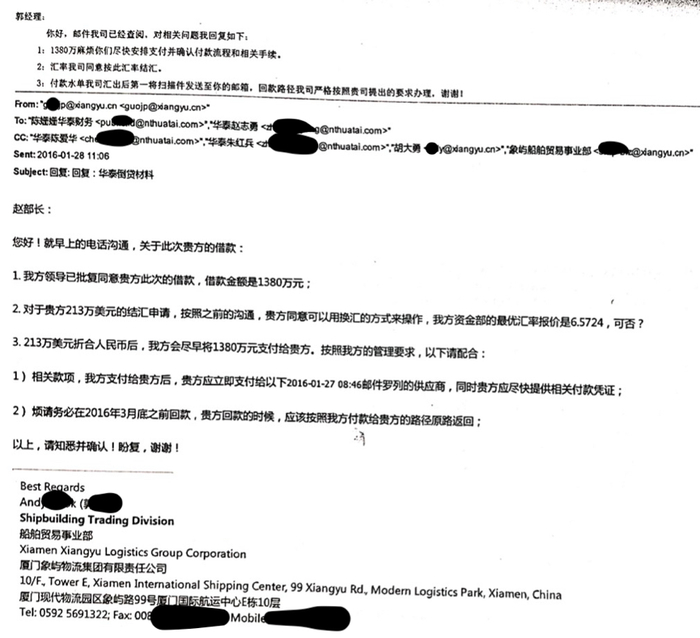 不过,在上述出口船舶代理协议下,2014年至2016年,象屿物流持续在向华泰重工“垫付造船款”,金额远超总造价的35%,即协议约定的最大垫款额。且邮件中,象屿物流的船舶事业部明确知晓,这些钱实际并未被用于造船,而是被用来偿还华泰重工各项银行欠款,以及人员工资发放等。