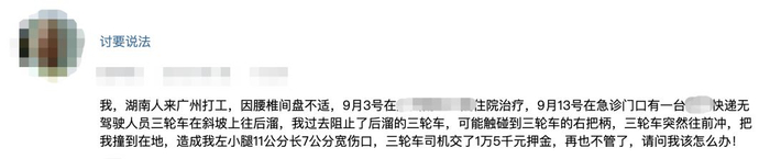 我,湖南人来广州打工,因腰椎间盘不适,2019年9月3号在广州某医院住院治疗。9月13号在急诊门口,有一台快递无驾驶人员三轮车在斜坡上往后溜,我过去阻止了后溜的三轮车,可能触碰到三轮车的右把柄,三轮车突然往前冲,把我撞到在地,造成我左小腿11公分长、7公分宽伤口。三轮车司机交了1.5万元押金,再也不管了,请问我该怎么办?