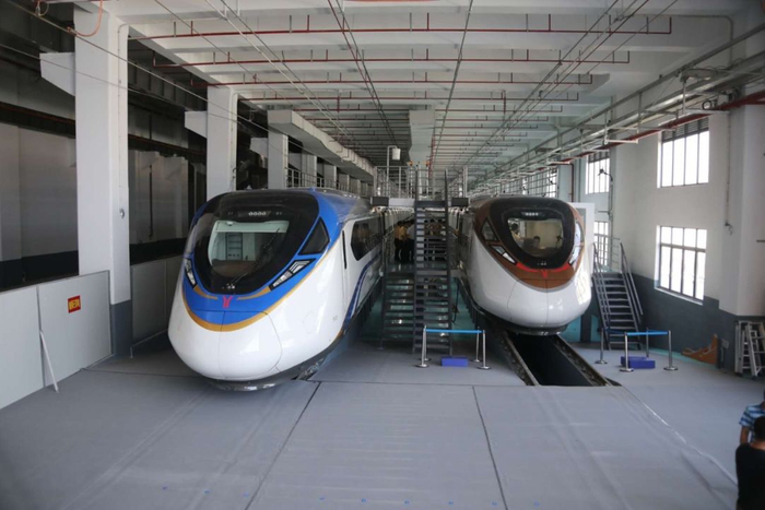 据中车株机副总工程师柳晓峰介绍,列车在设计过程中充分考虑了十八、二十二号线的快线特点,横纵结合座椅布局,使得载客量比高铁动车组多20%。中间车设置4对大开度双开塞拉门,实现乘客快速乘降。针对全隧道高速运营、全刚性接触网受流等复杂运行条件,列车采用流线型头型、一体化外风档、全密封设备舱,有效隔离外部噪声,在高速运行中给乘客带来舒适体验。