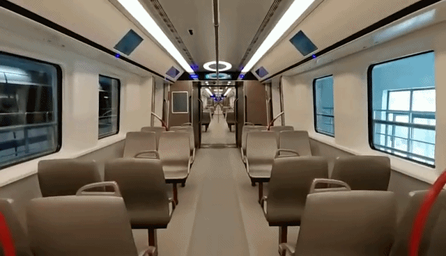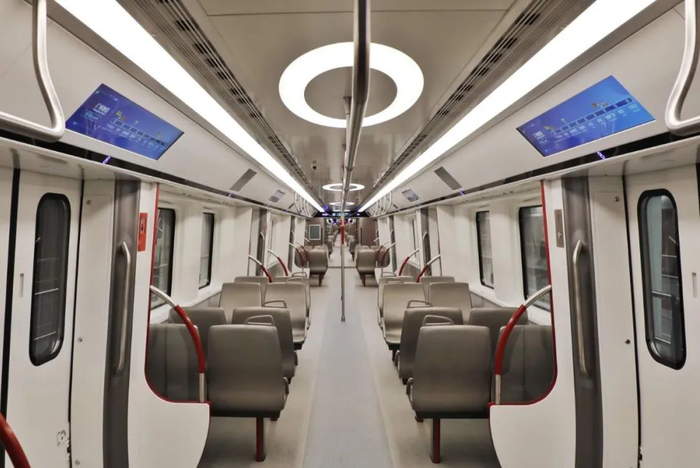 登上列车后,可以发现车厢里融入了高铁动车组的特点。车厢内座椅采用横纵结合布置,深空灰不锈钢座椅搭配地铁红;端墙则采取浅色木纹贴膜,彰显格调;配置的43寸LCD显示屏将给乘客出行提供更丰富的信息。客室还引入了健康照明系统,设置了暖光、自然光、冷光三个档位,当季节不同时,客室照明可实现灯光色温调节,让车厢光线更温馨和人性化。