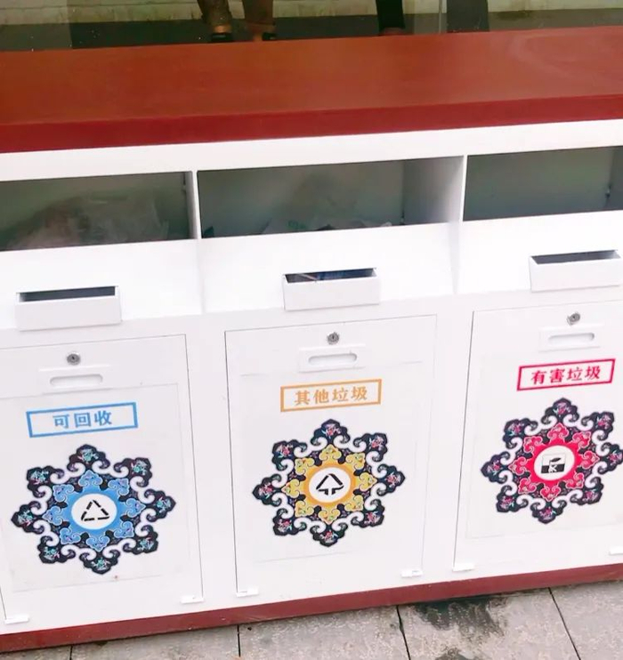 在休闲桌椅、地雕、树池、路灯、小品、城市家具等方面的设置上,强化方便性、舒适性的设计,比如吸烟区的设立,残疾人通道等等,也着力在文化特色上下功夫,比如花箱座椅植入皇家卷轴意向,垃圾箱图案与色彩参考云肩服饰及装饰彩绘手法,使其共同构成有一定连续性、引导性、节奏性文化景观带。