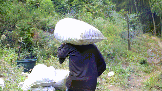 山上太陡车上不去,只能靠人工一袋袋背到山下去,几趟下来肩膀都磨破了皮。