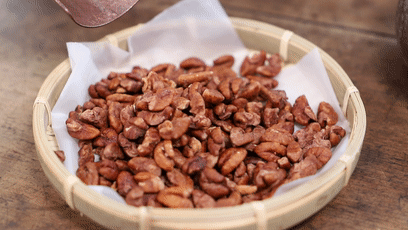临安家家户户都会自己炒核桃,方法也很简单,炒制时添加少糖少盐,不用别的添加剂、香精,核桃仁本身的香味已经足够了。